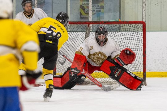 Ashton was sitting in the centre of a shooting gallery as the Lions peppered him. It was a rimmed around puck that the Eurekas hesitated on and Iain Duncan did not, that led to the next Lions goal. Duncan zipped a pass across to Dustin Hall waiting on the back door. He one-timed it in, and it was 3-0 Lions as the yellow guys were in full control of the game.